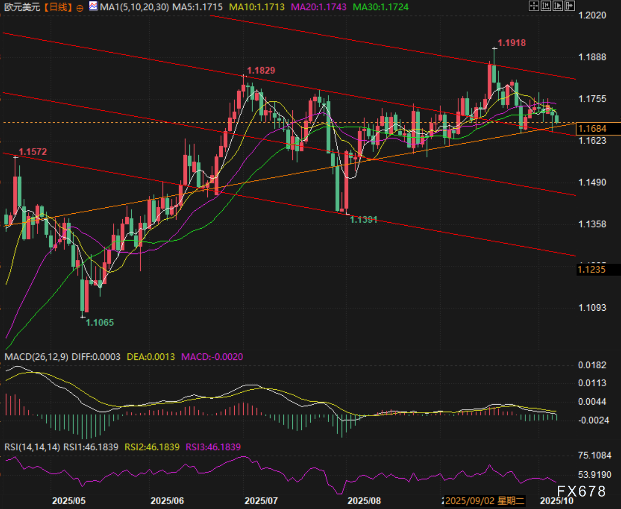 尽管美国局势因特朗普总统政策不确定性仍存较大担忧,但美联储持续维持高利率水平,当前这或许是遏制美元进一步走弱的唯一关键支撑。 昨日观经济议程无重大事件公布,因此市场焦点将集中在地缘政治动态及欧洲央行行长克里斯蒂娜`拉加德(ChristineLagarde)的讲话上。 欧元区数据暗示增长放缓,央行长释放鸽派信号 欧洲央行行长拉加德周一表示,即使风险似乎有所降低,但贸易和地缘政治紧张局势仍对欧元区的增长构成威胁。 昨日欧元区8月零售销售年增速为1%低于预期的1.3%,代表欧元区经济复苏进程受到阻碍,同时欧元区10月Sentix投资者信心指数为-5.4,依然无法达到0以上,即消费者和投资者对经济整体悲观也抑制了欧元的反弹。 她指出,由於新的贸易协议,与关税相关的重大下行风险出现的可能性下降,经济增长风险已变得更加平衡。然而,她又称,地缘政治紧张局势仍然是主要的不确定性来源。拉加德亦称,欧元仍然是仅次於美元的世界第二大使用货币,但她警告,面对不断变化的地缘政治局势,其全球角色并非稳定无虞。 拉加德对欧洲央行未来货币政策的暗示可概括为:短期受贸易和地缘政治紧张局势仍对欧元区的增长构成威胁(对经济增长的威胁不排除降息的可能)。长期视通胀和经济数据灵活调整;以数据依赖为核心,兼顾内部需求韧性与外部风险;通过强化监管和政策沟通稳定市场预期。这一路径既体现了对当前经济复苏的信心,也为应对潜在的不确定性预留了政策工具。投资者需重点关注2025年第四季度的通胀数据、地缘政治动态及美联储政策转向时点,这些将成为影响欧洲央行下一步行动的关键变量。 尽管主流投行普遍看好美元进一步走弱的可能性,但我们仍保持相对谨慎观点,由于欧元走弱,美元获得喘息机会,对于美元指数我们倾向于维持中立立场。 地缘政治影响欧元反弹 法国政治风波迎来新转折:过去两年内任命的第五位总理塞巴斯蒂安·勒科尔尼(SebastienLecornu),在组建内阁仅数小时后便意外宣布辞职。 马克龙(Macron)总统去年推动的提前大选决策未能奏效,因分歧严重的议会始终无法达成任何形式的妥协方案。 目前这位法国总统面临巨大压力:极左翼政党“不屈法国”(FranceUnbowed)与极右翼政党“国民联盟”(NationalRally)均明确呼吁对其启动弹劾程序。 该事件对金融市场的冲击已清晰显现:作为衡量法国资产风险溢价的核心指标,法国与德国10年期国债收益率差已扩大逾10个基点。 即便在美国政府持续停摆的背景下,欧元仍出现大幅下挫,昨日兑美元汇率跌幅接近1%。 同时由于欧洲议会的极右翼和极左翼党团都提出了对欧盟委员会主席冯德莱恩的不信任动议,欧洲议会定于本周四(10月9日)对此进行投票。当地时间10月6日,欧洲议会开始进行投票前的辩论。 来自法国极右翼政党国民联盟和极左翼政党“不屈法国”的欧洲议会议员发言,就加沙冲突问题和美欧贸易协议问题对冯德莱恩发难,称冯德莱恩“向美国总统特朗普投降了”,“冯德莱恩该下台了”。这是冯德莱恩在三个月内第二次面临被罢免的动议。 有分析指出,尽管欧洲议会主要的中间派党团议员预计将否认这两项动议,使其无法在本周四的投票中获得将冯德莱恩罢免所需的三分之二多数支持,但它们都反映出外界对冯德莱恩领导能力的更广泛不满,是对冯德莱恩的又一次严厉“警告”。这也会加剧欧元区的不确定性,短线使欧元承压。 技术分析: 欧元兑美元重新开始沿着下降通道运行,同时下方存在上升趋势线作为支撑,上升趋势线也为欧元小形头肩顶形态颈线,如果跌破则欧元兑美元将转为空头走势,同时RSI已经转空,5,10,20日均线均在汇价之上且拐头向下,也侧面支持后期汇价向下发展。