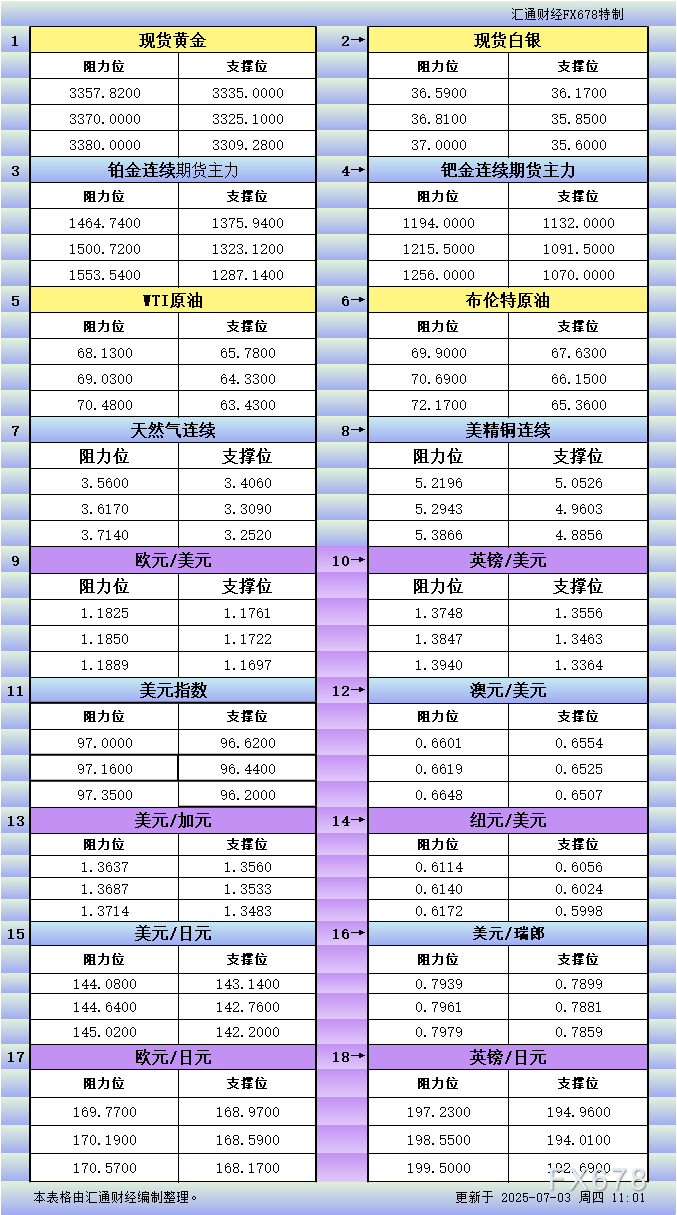 XM官网官网一张图看商品支撑阻力:金银油气+铂钯铜农产品期货(2025年7月4日